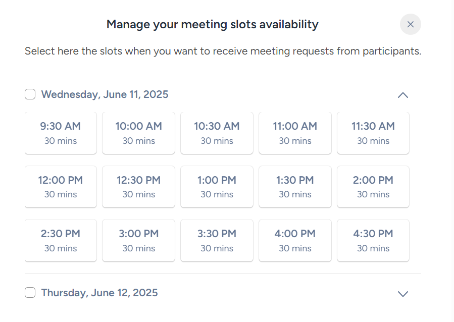 Here you will be able to manage your availability by either checking off certain times you want to setup meetings or checking the top left box next to each date to select all available times.
